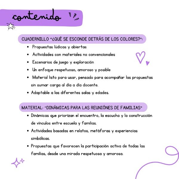 Este material propone una forma sensible, lúdica y respetuosa de iniciar el año en nivel inicial, poniendo en el centro el juego, la exploración y la construcción de vínculos. A través de los colores como disparadores, invita a las niñas y los niños a descubrir la sala, expresarse, experimentar con los sentidos y apropiarse del espacio escolar de manera gradual y amorosa.