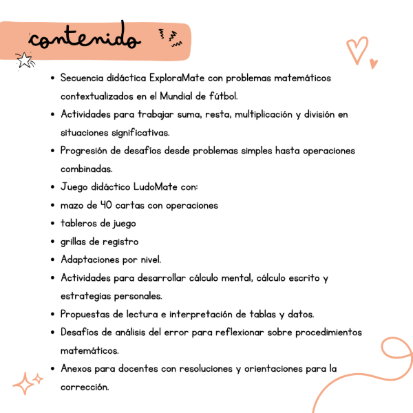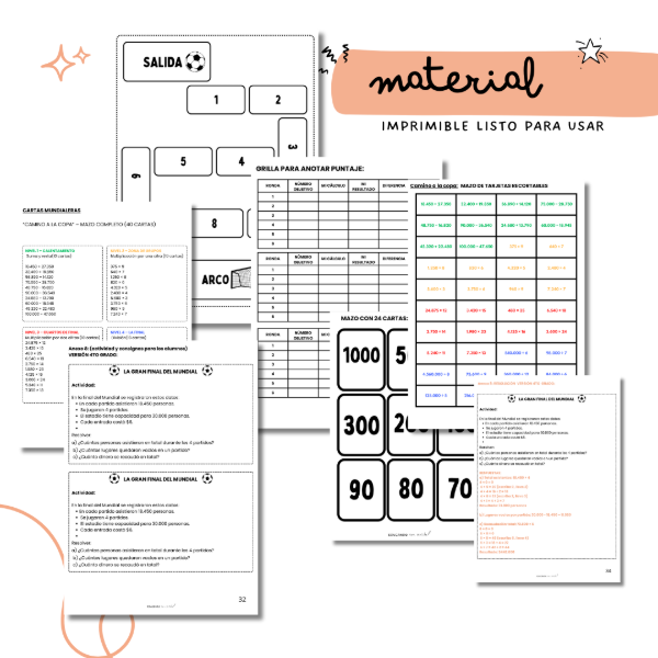 A partir de este hilo conductor, los estudiantes recorren diferentes desafíos matemáticos que avanzan desde la fase de grupos hasta la gran final, incorporando progresivamente problemas más complejos y operaciones combinadas.