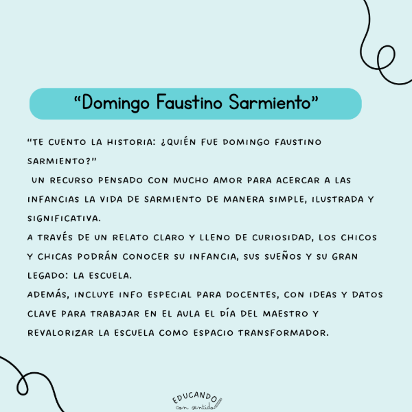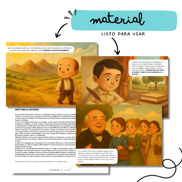 Este material didáctico en formato A4 horizontal es ideal para trabajar en el aula la vida y legado de Domingo Faustino Sarmiento, figura central de la historia argentina y reconocido como el Padre del aula.
